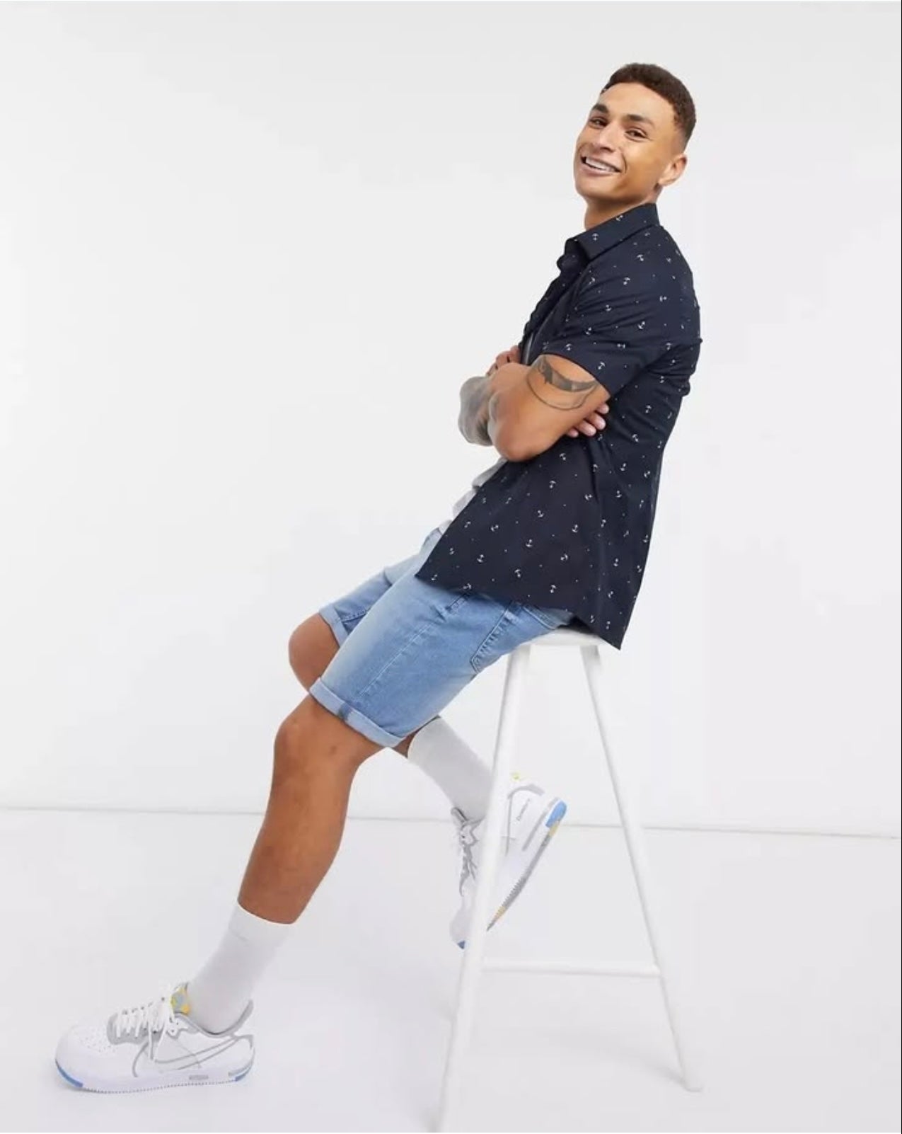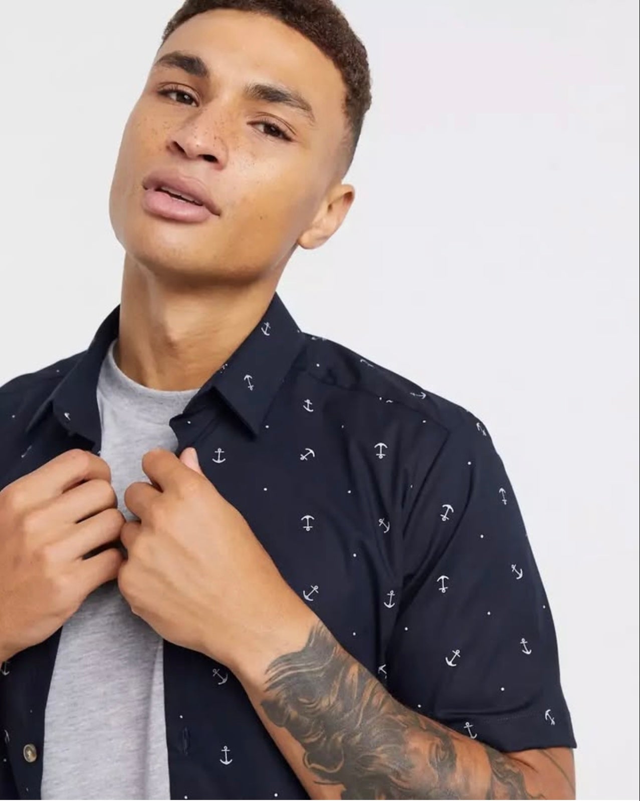 Asos Slim Fit Navy Short Sleeve Stretch Shirt in Anchor Print