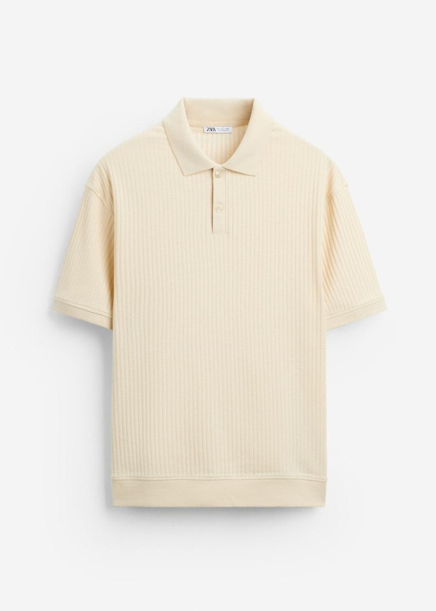 Collared polo shirt with a button upfront. Short sleeves. Ribbed trims.