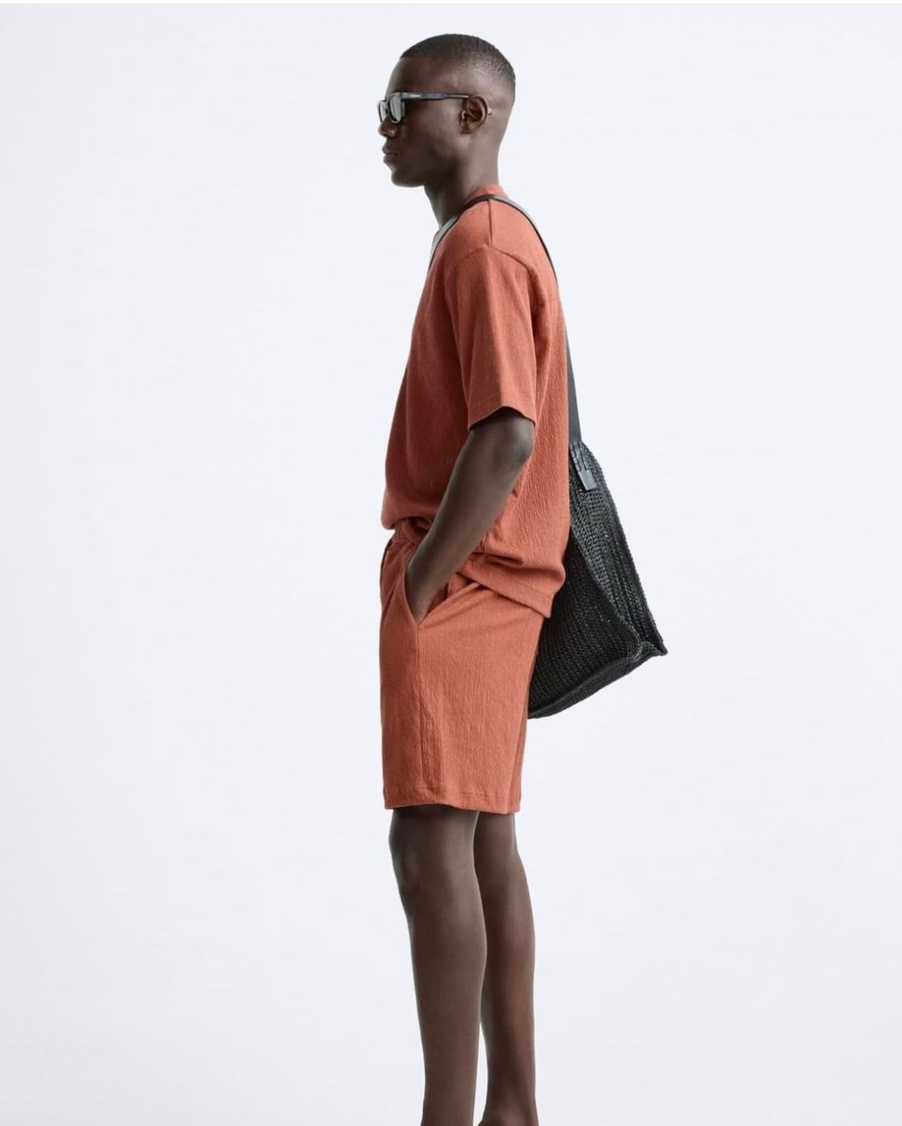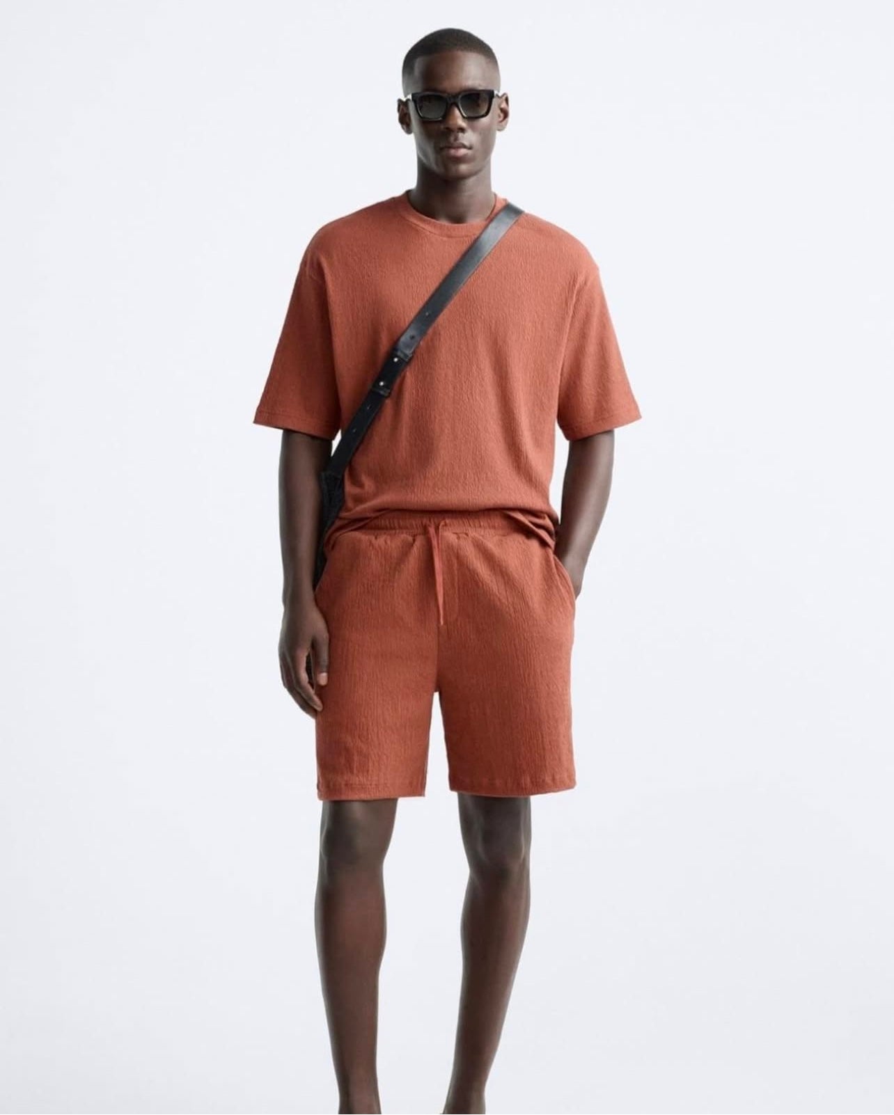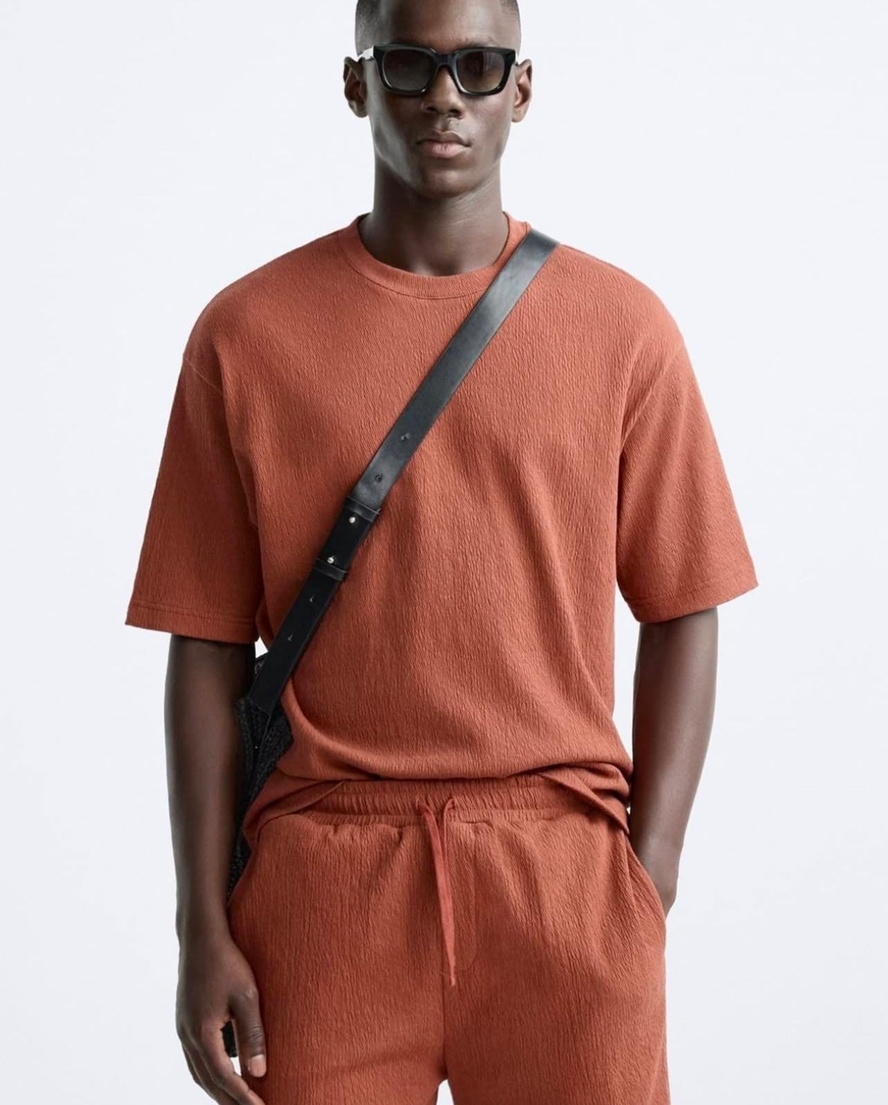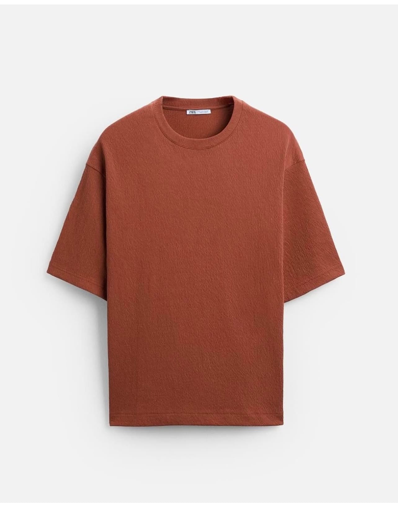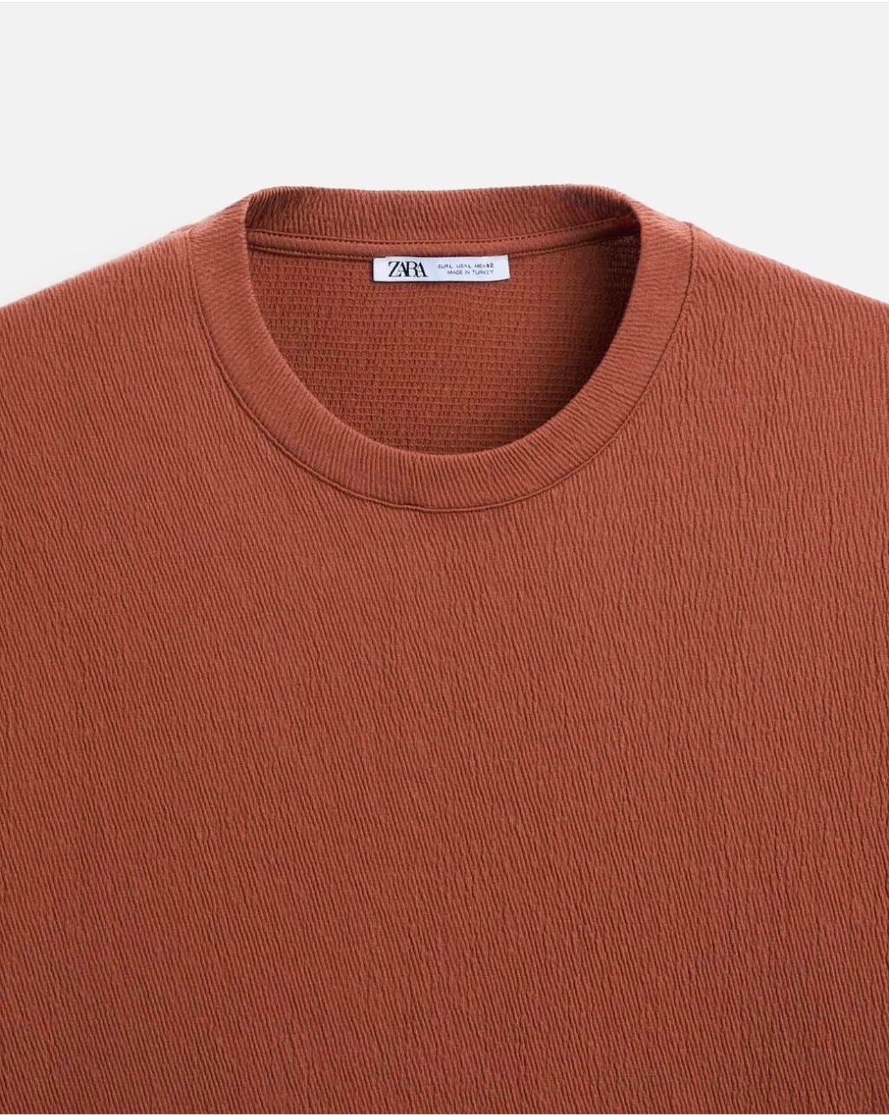 Zara Regular Fit Textured Cotton T shirt in Rust